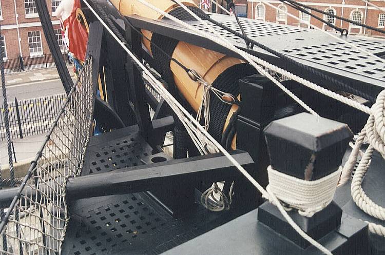 Widok z forkasztelu od strony burty lewej (portside) na tzw. knightshead (pachoł), bumkin (wąs dla halsu fokżagla), gretingi dziobowe i greting na bukszprycie (bowsprit gangboard).
