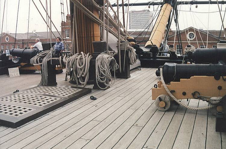 Pokład na forkasztelu, fokmaszt, w dali bukszpryt a z prawej działa 12-funtowe.