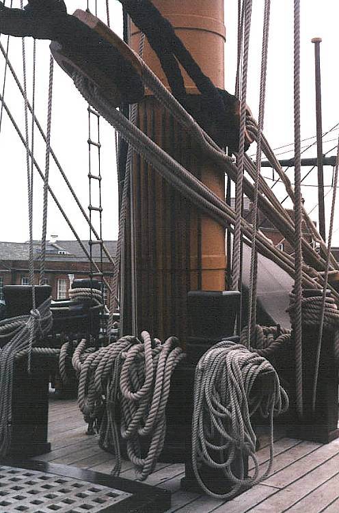 Fokmaszt na forkasztelu z ukośnie przebiegającym foksztagiem.
