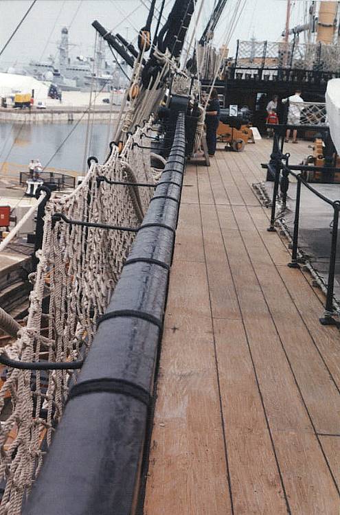 Tzw. ćwierćpokład (quarterdeck) od burty prawej - widoczne żurawiki z siatkami na hamaki przymocowanymi do poręczy.