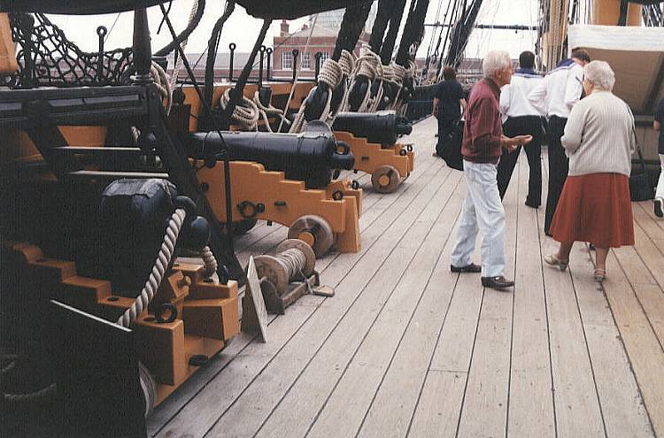 Ćwierćpokład - patrząc ku dziobowi. Z lewej - wejście na pokład rufowy, tzw. poopdeck oraz działa 12-funtowe od burty lewej.