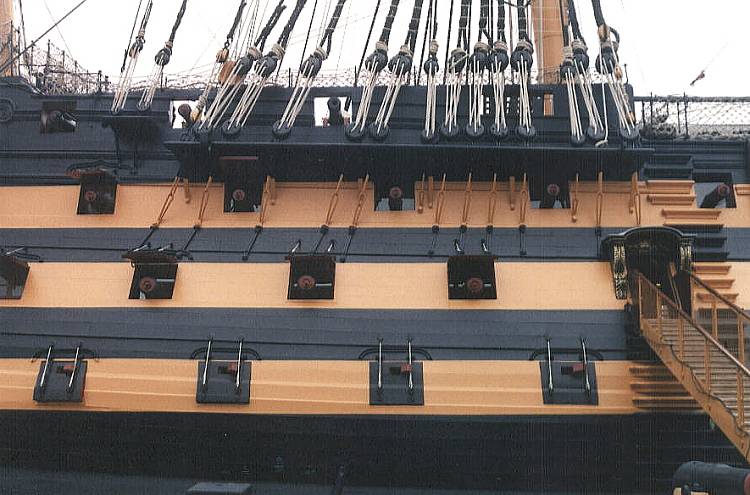 Fragment śródokręcia burty prawej. Tu widać dekoracyjnie rzeźbioną furtę wejściową w głąb kadłuba, baterie działowe wszystkich czterech pokładów i półkę talrepową bezanmasztu.