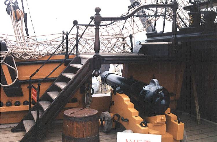 Wewnętrzna strona burty prawej na ćwierćpokładzie. Widoczne wejście na pokład rufowy tzw. poopdeck a pod nim - działo 12-funtowe.