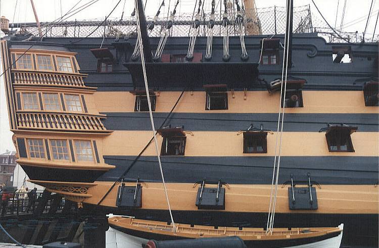 Część rufowa burty prawej. U góry - półka talrepowa bezanmasztu z jej talrepami. Po jej bokach - żurawiki z podwieszoną nań szalupą. Z lewej - ćwierćgalerie.