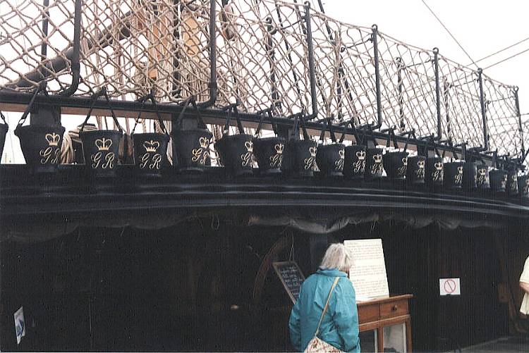 Break-of-the-poop z rzędem wiader na wodę ppoż. oraz żurawiki z siatkami na hamaki.